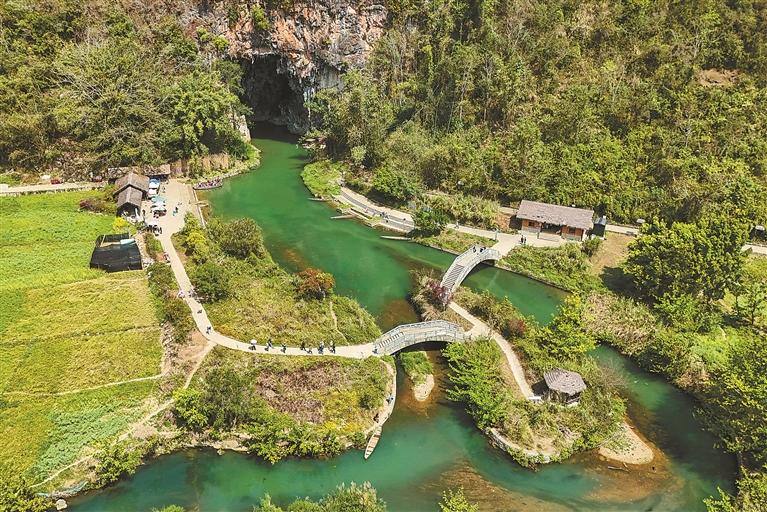 近年来,当地深入挖掘坝美村农文旅融合发展潜力,一方面打造沉浸式旅游体验项目,让游客在欣赏自然风光的同时,感受壮乡传统农耕文化;另一方面景区积极吸纳本地村民就业,鼓励其因地制宜创业增收,推动农业与旅游业互促共进。图为2026年3月17日,游客在云南省文山壮族苗族自治州广南县坝美景区游览(无人机照片)。新华社记者 彭奕凯 摄