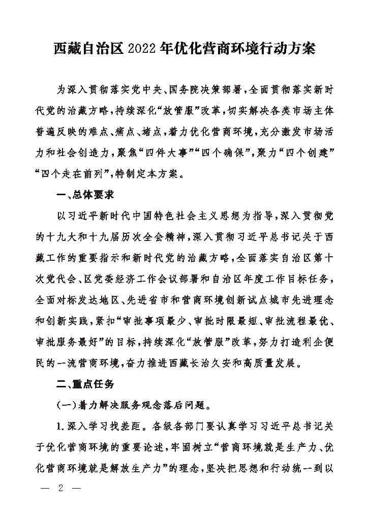 西藏自治区2022年优化营商环境行动方案